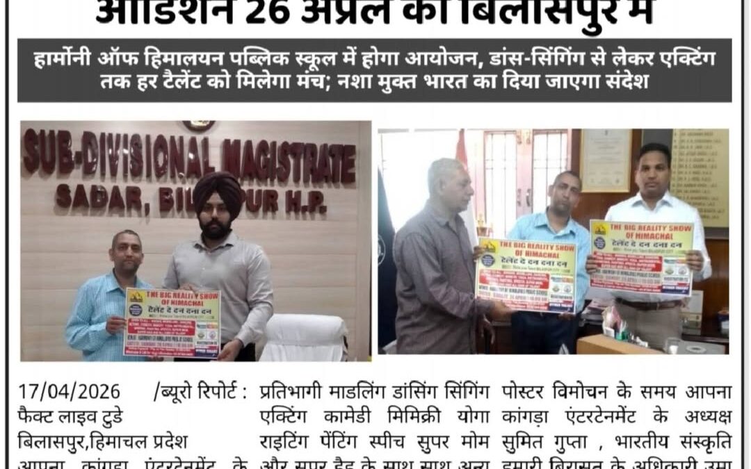 आपना कांगड़ा एंटरटेनमेंट के बैनर तले ” चिट्टे को भगाना है , देश को बचाना है ” को लेकर पूरे भारतवर्ष में छुपी हुई प्रतिभा को लेकर टैलेंट दे दन दना दन के आडिशन आयोजित किये जा रहे हैं , जो कि 26 अप्रैल रविवार को बिलासपुर के हार्मोनी आफ हिमालयन पब्लिक स्कूल में आयोजित किए जाएंगे, जिसमें प्रतिभागी माडलिंग डांसिंग सिंगिंग एक्टिंग कामेडी मिमिक्री योगा राइटिंग पेंटिंग स्पीच सुपर मोम और सुपर डैड के साथ साथ अन्य गतिविधियों में अपनी कला को दिखा सकते हैं और नशे और चिट्टे के खिलाफ जंग में साथ दे सकते हैं। डीसी बिलासपुर और उप मंडल अधिकारी बिलासपुर ने बिलासपुर आडिशन के पोस्टर का विमोचन किया और प्रतिभागायों से अधिक से अधिक संख्या में कार्यक्रम में भाग लेने का अनुरोध किया। पोस्टर विमोचन के समय आपना कांगड़ा एंटरटेनमेंट के अध्यक्ष सुमित गुप्ता , भारतीय संस्कृति हमारी बिरासत के अधिकारी उमा शर्मा , निशांत भारद्वाज और ए एफ आई डी फैशन डिजाइनर की संचालिका रीना ठाकुर जी बिशेष रुप से उपस्थित थे। कार्यक्रम में भाग लेने के लिए प्रतिभागी 9736454656 नंबर पर संपर्क कर सकते हैं।