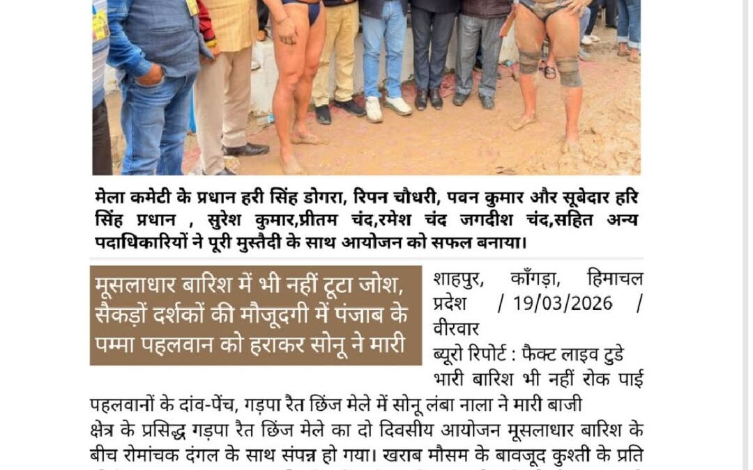 क्षेत्र के प्रसिद्ध गड़पा रैत छिंज मेले का दो दिवसीय आयोजन मूसलाधार बारिश के बीच रोमांचक दंगल के साथ संपन्न हो गया। खराब मौसम के बावजूद कुश्ती के प्रति लोगों का जुनून इस कदर था कि सैंकड़ों दर्शक घंटों तक बारिश में भीगते हुए अखाड़े के चारों ओर डटे रहे और पहलवानों का हौसला बढ़ाते रहे।