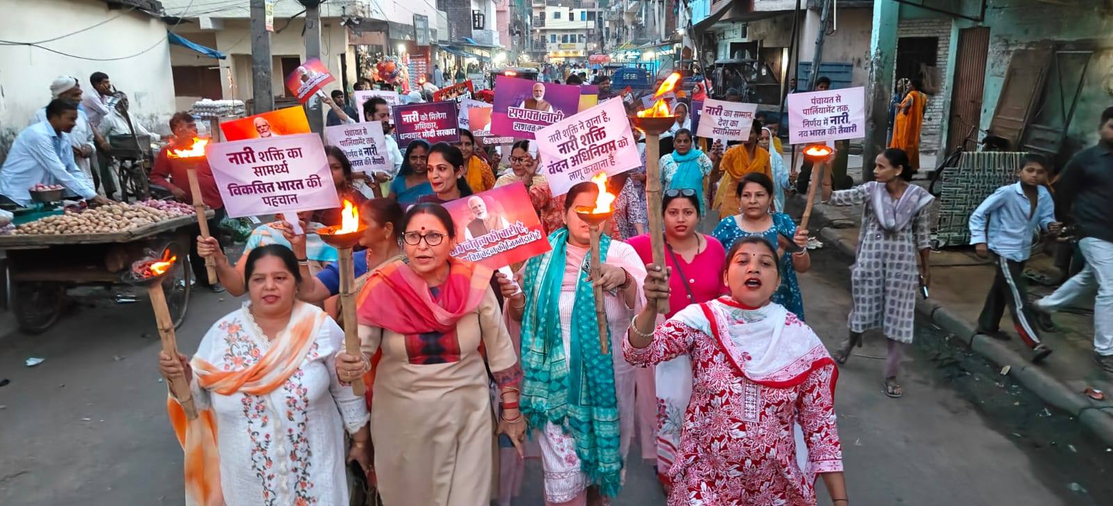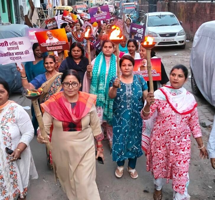 चंडीगढ़ के मौली जागरा क्षेत्र में आज महिलाओं के नेतृत्व में “नारी शक्ति वंदन अधिनियम” के समर्थन में एक प्रभावशाली जन आक्रोश मशाल पदयात्रा का आयोजन किया गया। इस पदयात्रा में शहर के विभिन्न क्षेत्रों से आई सैकड़ों महिलाओं ने भाग लेकर कांग्रेस एवं उसके सहयोगी दलों के खिलाफ अपना तीव्र विरोध दर्ज कराया। महिलाओं ने आरोप लगाया कि कांग्रेस और उसके सहयोगी दलों ने नारी शक्ति वंदन अधिनियम के विरोध में वोट कर नारी शक्ति का अपमान किया है, जिसे देश की महिलाएं कभी स्वीकार नहीं करेंगी।