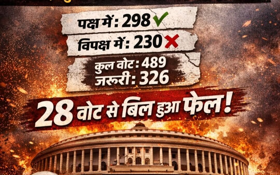 महिला आरक्षण बिल से जुड़ा संविधान संशोधन बिल संसद में गिर गया। बिल के पक्ष में 298 और विपक्ष में 230 वोट पड़े। लोकसभा में 489 सांसदों ने वोट डाले। बिलों को पास कराने के लिए दो तिहाई बहुमत की जरूरत थी। 489 का दो तिहाई 326 होता है। इस तरह बहुमत नहीं मिलने से ये बिल पास 28 वोट से गिर गया। 11 साल के शासन में यह पहला मौका जब मोदी सरकार सदन में कोई बिल पास नहीं करा पाई।