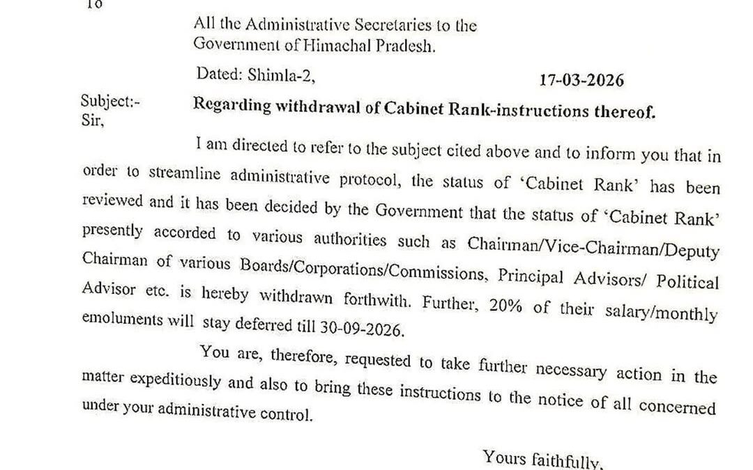 मुख्यमंत्री सुखविंदर सिंह सुक्खू का महत्वपूर्ण निर्णय: कैबिनेट रैंक वापस ली गई, 30 सितंबर 2026 तक 20 प्रतिशत वेतन/भत्ते स्थगित किए गए।