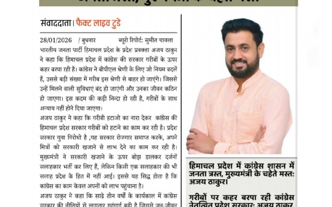 गरीबों पर कहर बरपा रही कांग्रेस नेतृत्वित प्रदेश सरकार: अजय ठाकुर।