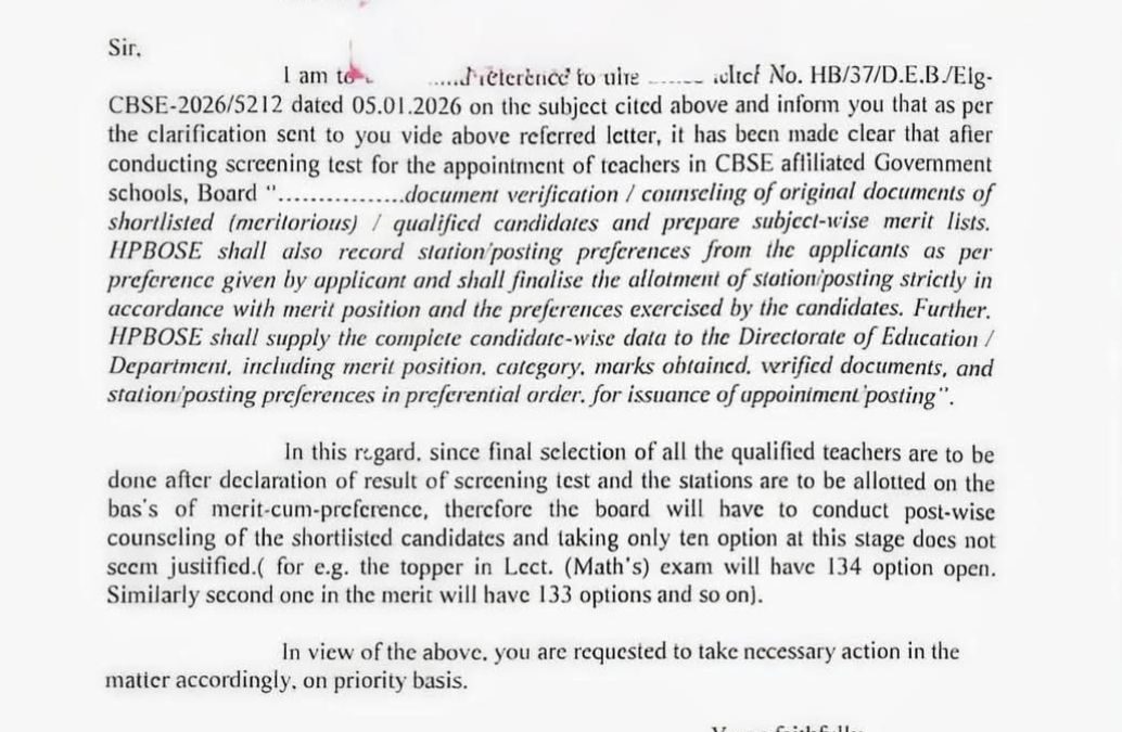 हिमाचल प्रदेश में CBSE स्कूलों में प्रिंसिपल और टीचर के डेप्युटेशन के लिए स्क्रीनिंग / सिलेक्शन टेस्ट कराने के बारे में मंज़ूरी और स्पष्टीकरण। CBSE स्कूलों के लिए…