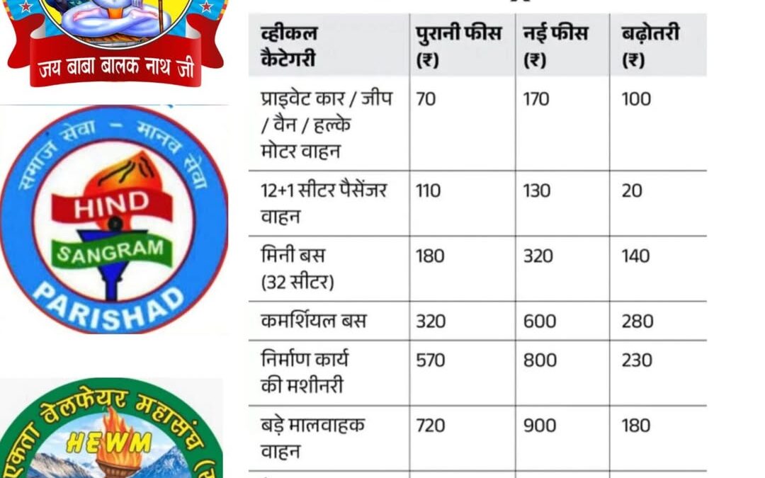 पंचकूला ( ):– हिंद संग्राम परिषद् रजि ट्राईसिटी, हिम एकता वेलफेयर महासंघ रजि हरियाणा , सिद्ध जोगी सेवा चेरीटेबल ट्रस्ट रजि हरियाणा ने हिमाचल प्रदेश में वाहनों की एंट्री फीस पर तुगलकी फरमान जारी करके दूसरे राज्यों से आने वाले प्रवासी हिमाचली के वाहनों व अन्य बाहरी जनता के साथ घोर अन्याय किया है। इसलिए हिंद संग्राम परिषद् हरियाणा, पंजाब, चंडीगढ़ व हिम एकता वेलफेयर महासंघ ट्राईसिटी व हरियाणा , सिद्ध जोगी सेवा चेरीटेबल ट्रस्ट हरियाणा, हिमाचल सरकार के इस तुगलकी फरमान का पूरजोर विरोध करती है। क्योंकि इस बार तो हद से ज्यादा हद करके डबल से भी ज्यादा एंट्री फीस कर दी जाएगी ।
