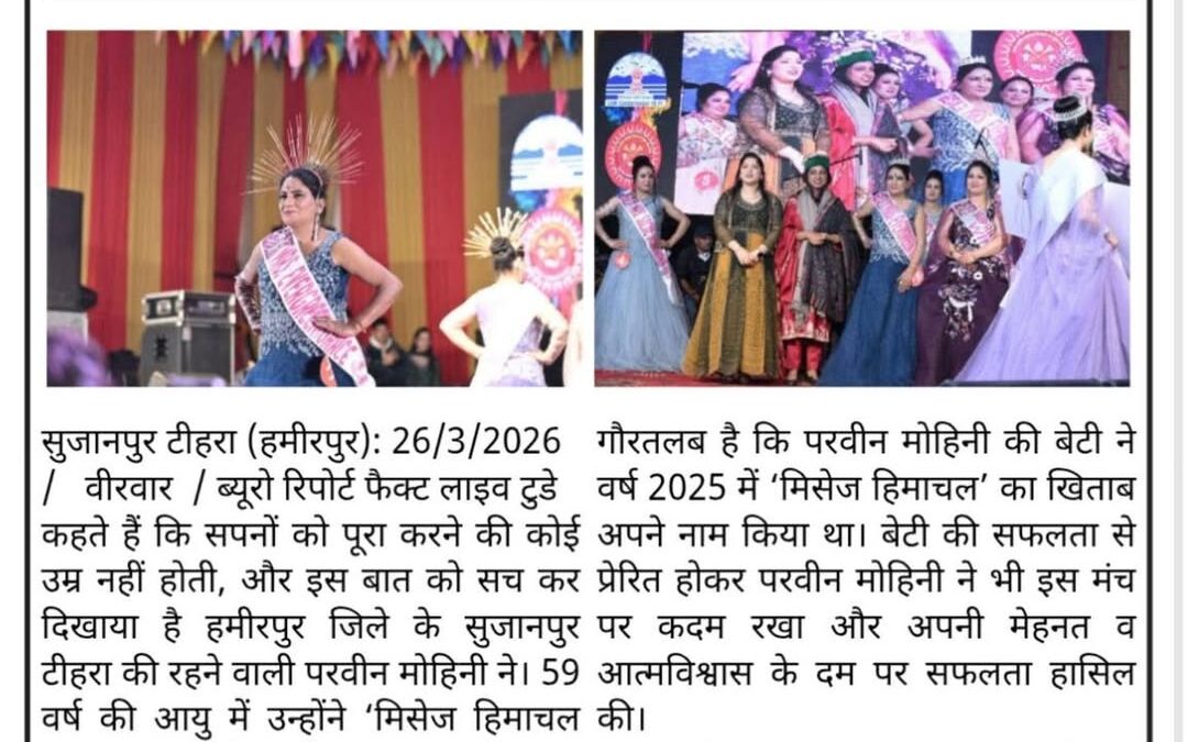 कहते हैं कि सपनों को पूरा करने की कोई उम्र नहीं होती, और इस बात को सच कर दिखाया है हमीरपुर जिले के सुजानपुर टीहरा की परवीन मोहिनी ने। 59 वर्ष की आयु में परवीन मोहिनी ने ‘मिसेज हिमाचल 2026’ प्रतियोगिता में भाग लेकर न केवल अपनी प्रतिभा का लोहा मनवाया, बल्कि ‘स्पेशल कैटेगरी’ का क्राउन भी अपने नाम किया। उनकी यह उपलब्धि आज प्रदेश की तमाम महिलाओं के लिए प्रेरणा का स्रोत बन गई है।सफलता का श्रेय परिवार और बेटी को दिया