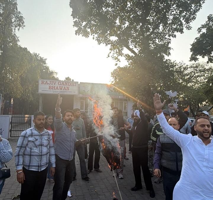 चंडीगढ़। चंडीगढ़ युवा मोर्चा द्वारा AI समिट में युवा कांग्रेस के प्रदर्शन पर भड़की भाजपा चंडीगढ़ युवा मोर्चा ने सेक्टर 35 कांग्रेस भवन के बाहर राहुल गाँधी और कांग्रेस का पुतला फूंका। युवा मोर्चा ने आरोप लगाया कि राहुल गांधी की लीडरशिप में, कांग्रेस वर्कर्स ने टॉपलेस होकर वेन्यू पर हंगामा किया, यह काम साफ तौर पर दुनिया के मंच पर भारत को शर्मिंदा करने के लिए किया गया।